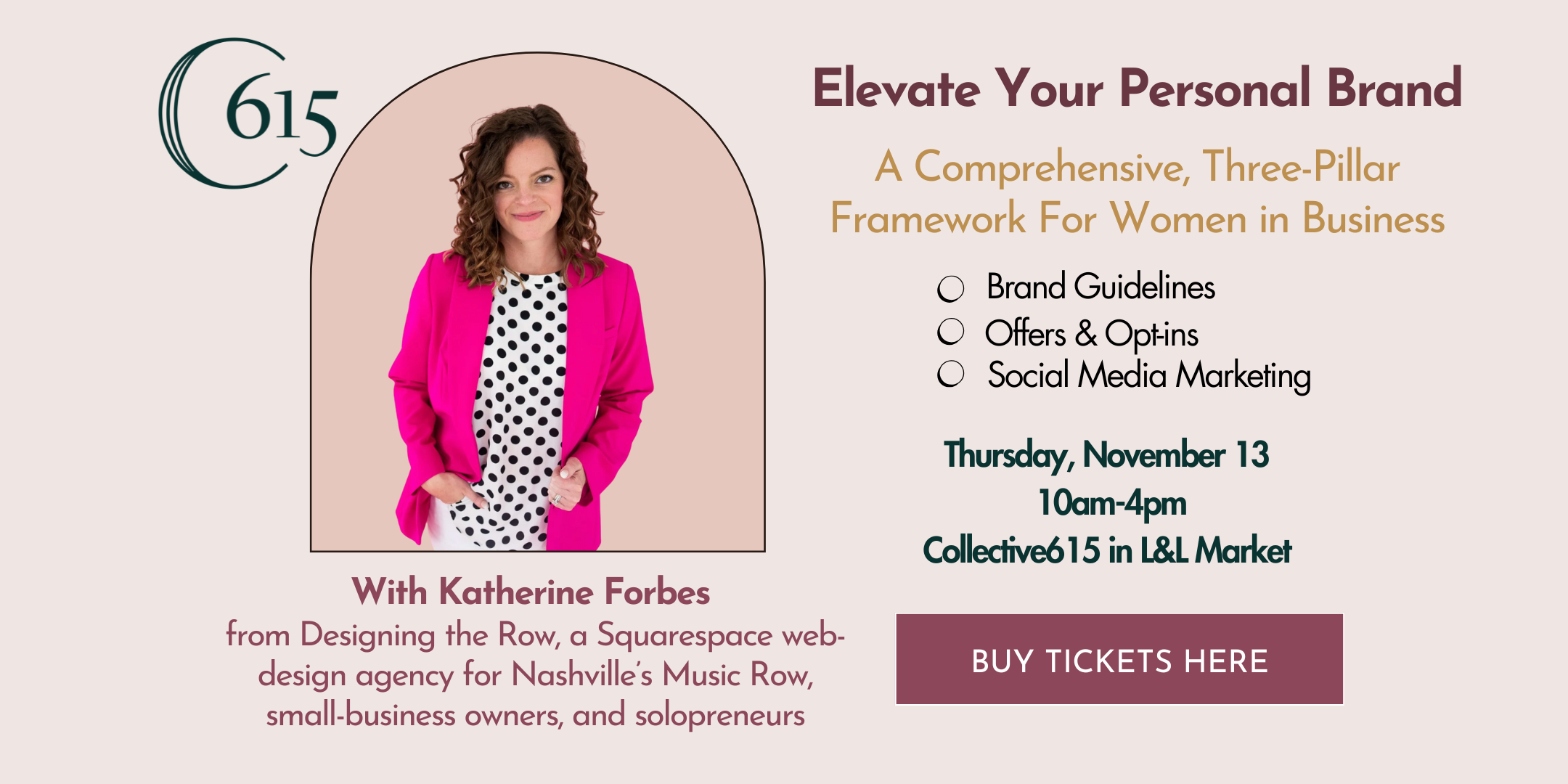 Join us at Collective615 as C615 member and website-design/digital marketing expert Katherine Forbes leads this full-day interactive workshop. She will provide you with a comprehensive, complete framework for building and enhancing your personal brands.